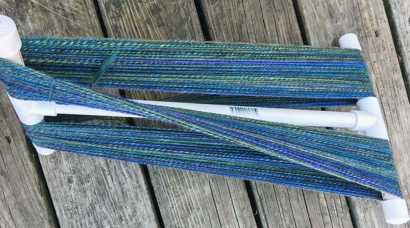 If you’re a spinner, you know that you need to get your yarn off your spindle or spinning wheel in order to use it. You can’t wind it directly into a ball because the yarn that comes off your spindle or wheel isn’t finished until the twist has been set by soaking or steaming. I like setting my yarn with steam because it’s quicker than soaking it and waiting for it to dry, and I’ve had pretty good results with this method. The PVC niddy noddy is great for this because it can get a little wet without having any problems, unlike wood.