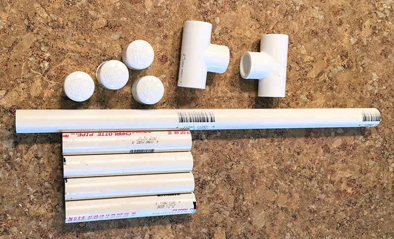 To make a 2 yard niddy noddy, you will need five pieces of PVC pipe:
