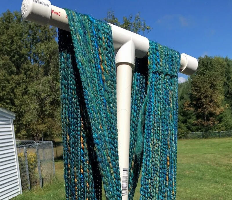 The PVC niddy noddy is also great for holding your yarn while you dye it so that it doesn’t get tangled up or knotted, but you still have easy access to the full length of the yarn. This works well if your un-dyed yarn came in a skein to begin with. You just need to untwist it and put it over the arms of the niddy noddy.